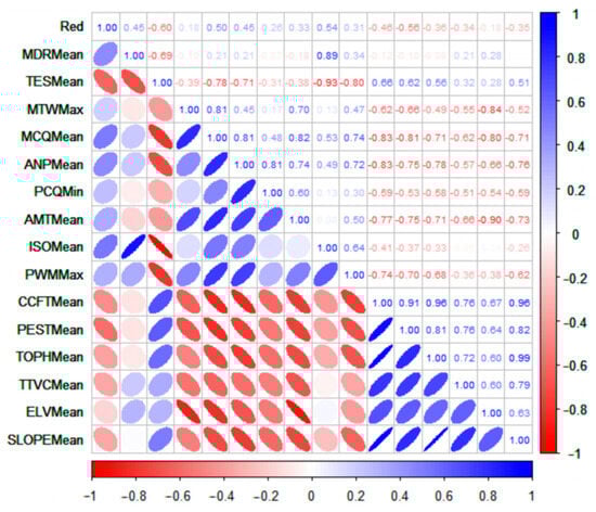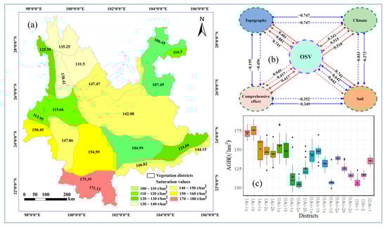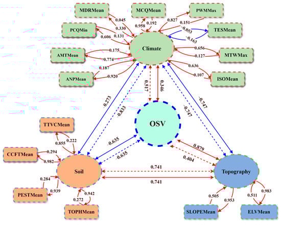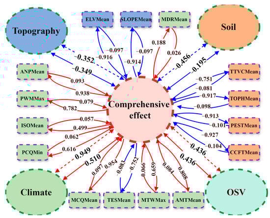 - It was evident that the three environmental factors had a strong comprehensive effect (0.436) on the OSVs. The climate factor had the highest effect (0.414) on the OSVs, followed by the soil factor (−0.199) and the topography factor (−0.153). The MCQMean variable showed the highest comprehensive correlation (0.416) with the OSVs.