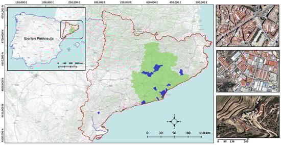 Geographic positioning and ground truth data distribution: the study was centered in the Catalan region, with particular attention to the Barcelona province owing to its landscape diversity, including rural areas, dense urban centers, and important industrial zones, where asbestos constructions are very frequent. Ground truth data were rigorously gathered from various sites (municipalities highlighted in blue). The accompanying magnified images on the right side are illustrative of the ground truth diversity, including urban, industrial, and rural areas.