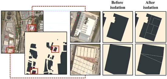 To accurately isolate buildings from aerial images, we first obtained the shapefile delineating the separation of buildings from the INSPIRE Services of Cadastral Cartography (http://www.catastro.minhap.gob.es/webinspire/index_eng.html, accessed on 1 February 2024). This file classifies buildings based on their adjacency, even allowing for the differentiation of attached structures.