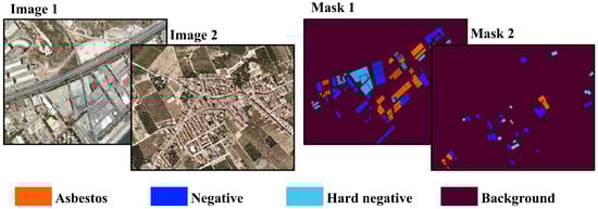 Taking a subset of the previous general collection (every building represented), we generated a training dataset from the available binary masks of rooftops. To achieve this objective, the ground truth data collected by DetectA were the main inputs. First, the geometry features were analyzed to avoid any possible geographical misalignment between vector layers and the aerial images. Subsequently, the data were converted into a three-class raster, with an assigned code for asbestos, non-asbestos, and “background” (referring to anything other than the building’s rooftop). That is, the dedicated masks, with the same dimensions as each image frame ( pixels), were generated in the form of a four-valued matrix (Figure 4).