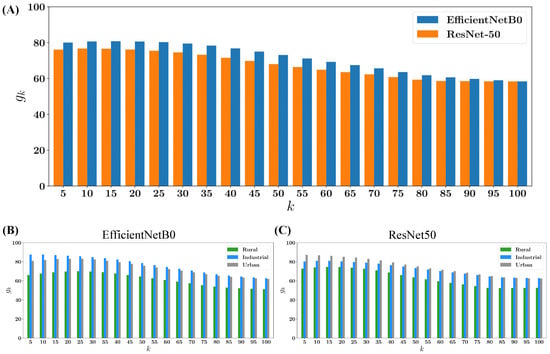 On the other hand, panels (B) and (C) of Figure 8 illustrate the average of the Grad-CAM quantification for each context area—rural, industrial, and urban—in our dataset, as analyzed for EfficientNetB0 and ResNet50, respectively. Images of rooftops from rural environments exhibit the weakest performance compared to the other two contexts. Our hypothesis is that it is common to see lichen-covered asbestos rooftops, which deviate significantly from the usual and expected grayish color. Additionally, we observe that the Grad-CAM outputs from EfficientNetB0 demonstrate superior performance in industrial settings, where, on average, almost 90% of the top five highest activations are correctly localized within the rooftop area. Conversely, ResNet50 exhibits better performance with urban images. These plots provide a comprehensive overview of how each model generally responds to different environmental settings, facilitating a deeper understanding of their contextual differences.