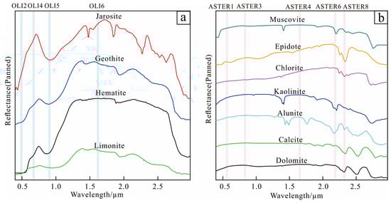 The extraction of mineralization alteration information from multispectral images was mainly conducted based on the method of principal component analysis (PCA). The PCA, as one of the common methods of extracting alteration information of remote sensing, is characterized by undemanding quality of atmospheric correction images, easy realization and being effective and steady and is widely used by geologists [22,23,24]. Its essence is the compression of the number of remote sensing variables in multispectral information through orthogonal transformation, and the concentration of useful information into new components, as far as possible. Each component is unrelated to the others, thus providing highlights of specific geological content [25,26]. As there is a different spectral response mechanism to the radicals and ions of each mineral, the recognition ability in relation to each mineral is also different. Combined with the spectral response mechanism of typical altered minerals in visible-near-infrared and short-wave infrared (VNIR–SWIR) spectra, this indicates that iron-stained alteration minerals take on some diagnostic features in the VNIR (0.4~1.3 μm) band (Figure 2a), while the hydroxyl alteration minerals present some diagnostic features in the SWIR (1.3~2.5 μm) band (Figure 2b).
