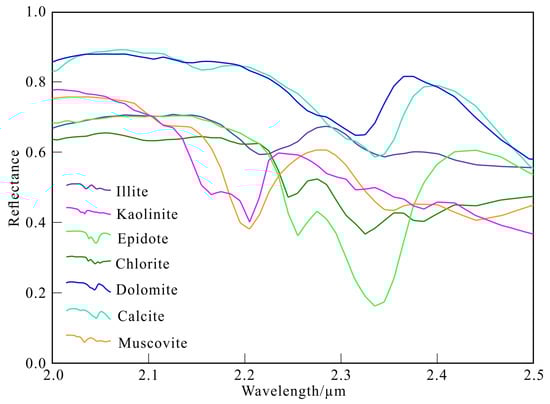 Hyperspectral data have the characteristics of significant volume and redundant information, so the minimum noise fraction (MNF) was first used to denoise and reduce the dimensions of the preprocessed data, and the useful signal was concentrated in the front band to reduce the correlation between each band. After that, the pure pixels were delineated through calculating the pixel purity index (PPI) and employing N-dimensional visualization tools, and the unknown endmembers were identified with the use of a standard spectrum library or measured spectrum, focusing on comparing the positions of the diagnostic absorption characteristics of various alteration minerals and, finally, determining the spectral curves of typical alteration minerals in the study area (Figure 3).