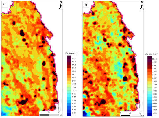Geochemical anomalies in the study area: (a) Cu anomaly in the study area; (b) Au anomaly in the study area.