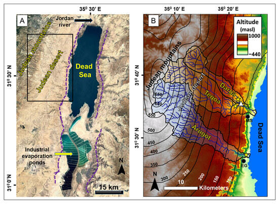 (A) A satellite image of the Dead Sea rift, the Dead Sea, and the Judean Mountains and desert. The location of the escarpment bordering the rift is indicated by the purple dashed line. The black rectangle denotes the position of the map presented in (B). (B) An altitude map of the Judean desert, focusing on the Darga and Arugot drainage basins. Contour lines indicate average annual precipitation values in mm. Black dots labeled as EG and MS denote the two communities of Ein Gedi and Mizpe Shalem, respectively. Blue lines indicating the main tributaries. The drainage basin of the Darga stream is shaded in semi-transparent orange and divided into three sub-basins: Darga tributary, Teqoa tributary, and the combined Darga stream downstream of the former two. The confluence of the Darga and Teqoa tributaries is marked by a white triangle. The drainage basin of the Arugot stream is highlighted in semi-transparent white. Yellow stars indicate the hydrometric stations whose data was utilized in this study.