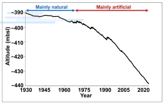 Over the past few decades, a significant proportion of the world’s largest lakes have experienced alarming volume loss which is an expression of reducing inflows compared to evaporation [1]. This trend is a major concern due to the potential for negative impacts on the environment, infrastructure and human populations. The water volume decrease is associated with: (i) increased water consumption in the lakes’ drainage basins [2,3,4,5]; (ii) climate-related changes, including elevated evapotranspiration rates and reduced water run-off [6,7,8,9,10], and (iii) combinations of the abovementioned factors [11,12,13,14].