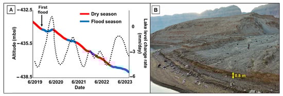 The research spanned four flood seasons and the three intervening dry seasons. The most substantial reduction in lake level occurred during the dry seasons, averaging 0.94 m, in contrast to the 0.28 m observed during the flood season (Figure 9A). Furthermore, the dry season exhibited the highest daily drop rate, averaging 0.41 cm/day, compared to the 0.19 cm/day recorded during the flood season (Figure 9A). Notably, wave abrasion during the dry seasons led to the formation of sub-vertical knickpoints at the outlets of the streams, reaching heights of up to 1 m (Figure 9B). These knickpoints persisted until the occurrence of the first flood of the floods/winter/wetter season.