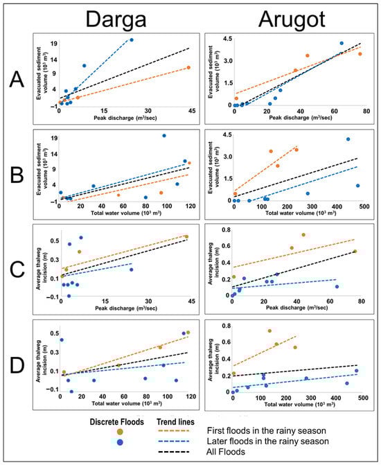 The relations between flood hydrology and the corresponding geomorphological responses in the Darga (left column) and Arugot (right column) streams. The graphs are organized in two columns and four rows, labeled (A–D). Rows (A,B) present the relation between peak discharge or total water volume and the volume of evacuated sediment (negative sediment budget). Rows (C,D) illustrate the relation between peak discharge or total water volume and the average thalweg incision (elevation lowering). Dots denote discrete flood events, while dashed lines represent trend lines. Colors represent the relative timing of the events.