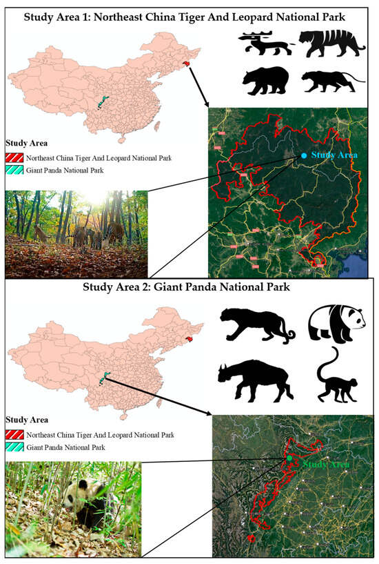 The two main study areas of this research are presented separately: the Northeast Tiger and Leopard National Park, and the Giant Panda National Park. The main wildlife species in each study area are indicated in the upper right corner of the respective pictures. The blue and green dots in the first and second images represent the exact location of the two study areas, which have been labelled with “Study Area”.