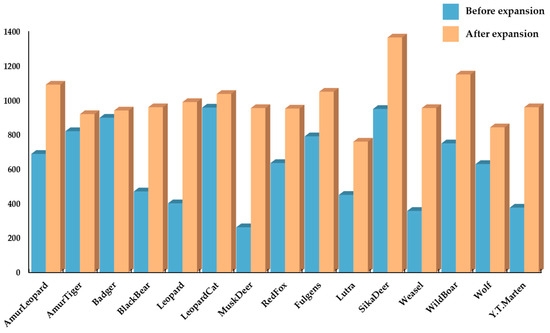 Therefore, for this specific part of the image data, we have designed an image quality enhancement method based on deep learning techniques in order to enhance the fuzzy images. We utilized the torch vision library provided by the PyTorch deep learning framework for image quality enhancement. This method generates similar but not identical training samples by enhancing the image quality [39]. This helps in expanding the size of the training set. Additionally, it reduces the model’s reliance on specific attributes, thus improving the model’s ability to generalize. A comparison of the number of images for each type of animal before and after data expansion and enhancement is shown in Figure 5. It can be observed that the amount of image data for each type of wildlife is well-balanced after the implementation of data expansion and enhancement techniques, thereby meeting the dataset quality standards required for model training and validation. To introduce a certain level of error in the image data and also ensure its experimental value, as well as to prevent overfitting to some extent, we applied a suitable amount of Gaussian noise to the obtained image data.