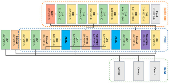 Similar to the backbone module, we have reconstructed the feature extraction unit in the neck part of WL-YOLO. We have incorporated the CBAM attention mechanism with the objective of achieving attentional learning at each layer of the feature map as it passes through the neck part. This allows the attention mechanism to focus on each local feature. The overall structure of the neck network is illustrated in Figure 10.
