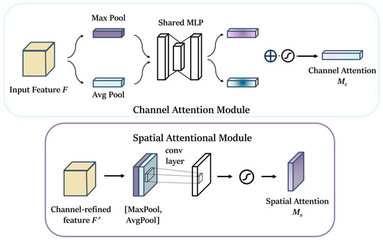 The schematic illustrates the workflow of the channel attention mechanism and the spatial attention mechanism, with the upper half representing the channel attention mechanism and the lower half representing the spatial attention mechanism.