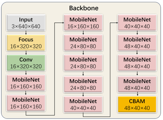 In the backbone module of WL-YOLO, we utilize the MobileNet module and convolution module to enhance the backbone module. Additionally, we employ CBAM to significantly decrease the number of parameters without compromising accuracy. By incorporating CBAM at the end of the backbone part, all of the generated feature maps are passed to CBAM, granting CBAM a global field of view. The structure of the backbone is depicted in Figure 9.