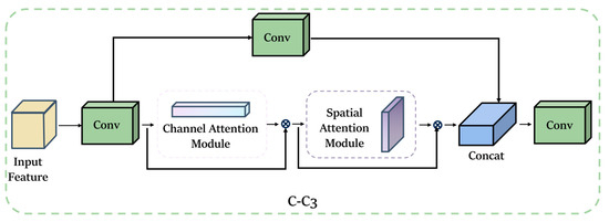The neck part of the native model utilizes the C3 module to reduce the computational cost by imposing a bottleneck module after convolution, followed by reorganization. Although this effectively reduces the computational cost, it also results in feature loss. Therefore, in the neck part, we suggest replacing the previous bottleneck module with a C-C3 module based on the attentional mechanism. This modification enhances the attention capability of the mechanism without incurring additional computational costs. The structure of the C-C3 module is depicted in Figure 11.