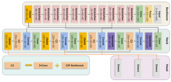Schematic diagram of the overall structure of the WL-YOLO model. The overall network architecture of the YOLOv5s is maintained, with the same backbone, neck, and head networks. However, we have replaced these networks with new modules and changed the size of the detection head in the head network. The pink squares represent our new MobileNet module, the grey ones represent the input and output modules, the light yellow ones represent the Focus module, the light green one represents the convolution module, the orange one represents the CBAM module, the purple one represents the Upsample module, the light orange one represents the C3 module, and the light blue one represents the Concat module, and the different colors represent different network modules.