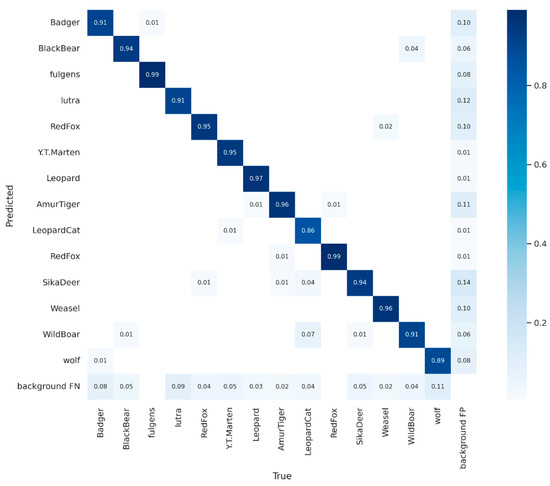 The dataset used for the experiments consisted of 14 main categories: badger, black bear, red panda, otter, red fox, marten, leopard, Amur tiger, leopard cat, Sika deer, weasel, wild boar, and wolf. Figure 3 displays representative images from the training dataset used in this paper. The dataset comprises a total of 14,000 image data, with 1000 images per category. Each category includes 500 visible image data and 500 infrared image data. Additionally, a small amount of video data has been included to test the model. This means that the video data is converted frame-by-frame into image data to be input into the model in order to test its target detection effect at higher frame rates. To ensure the dataset’s versatility and diversity, we included images that exhibit various characteristics such as limited or full light, high or low visibility, high levels of occlusion, and complex backgrounds, among others. Furthermore, the dataset encompasses variations in terms of image resolution, orientation, and grayscale. The subsequent section provides a more detailed description of these specific aspects of variation.
