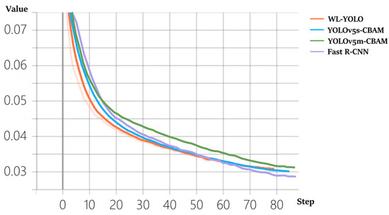 Upon comparing the changes in loss function among WL-YOLO, Faster R-CNN, and YOLOv5m variants of the model, it is evident that the WL-YOLO model converges faster when compared to the other models (The light pink line in the figure represents the variation of the loss function during the actual training of the WL-YOLO model, and in order to make it look more intuitive, we have increased the smoothing, which is shown by the orange line on the way).