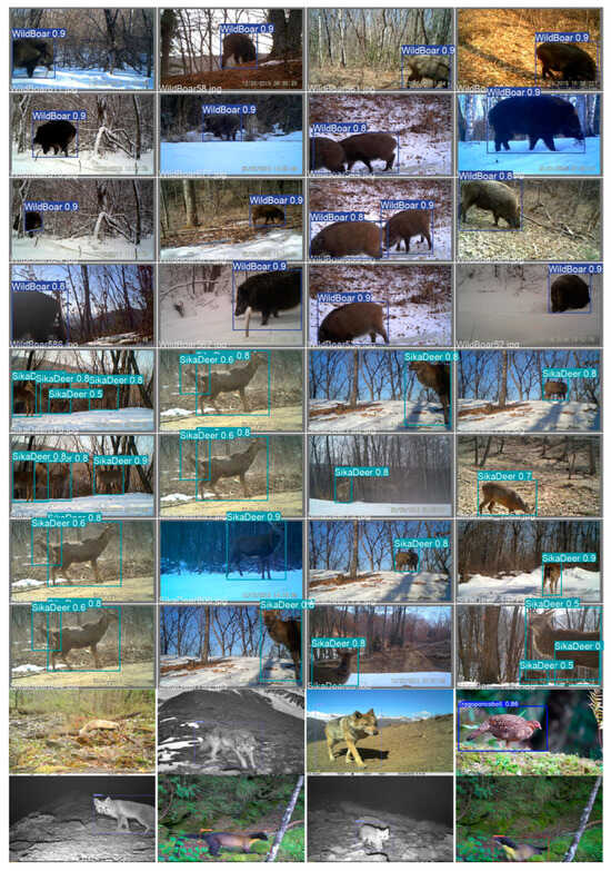 To better showcase the ability of WL-YOLO in detecting wildlife targets, categorizing wildlife target categories, and detecting concealed wildlife targets in complex backgrounds, we created a dedicated test dataset. This dataset consists exclusively of wildlife image data captured in complex forest environment backgrounds. The specific detection results can be observed in Figure 16. As seen in the figure, WL-YOLO successfully detects the wildlife targets present in the image data. This includes instances where the background environment is cluttered, the target’s pattern is concealed, and the lighting conditions are poor. WL-YOLO exhibits superior performance in handling these challenges. Furthermore, when there are multiple wildlife targets in the image, the model can accurately identify and select all targets by automatically determining the suitable anchor frame based on the size of the targets.