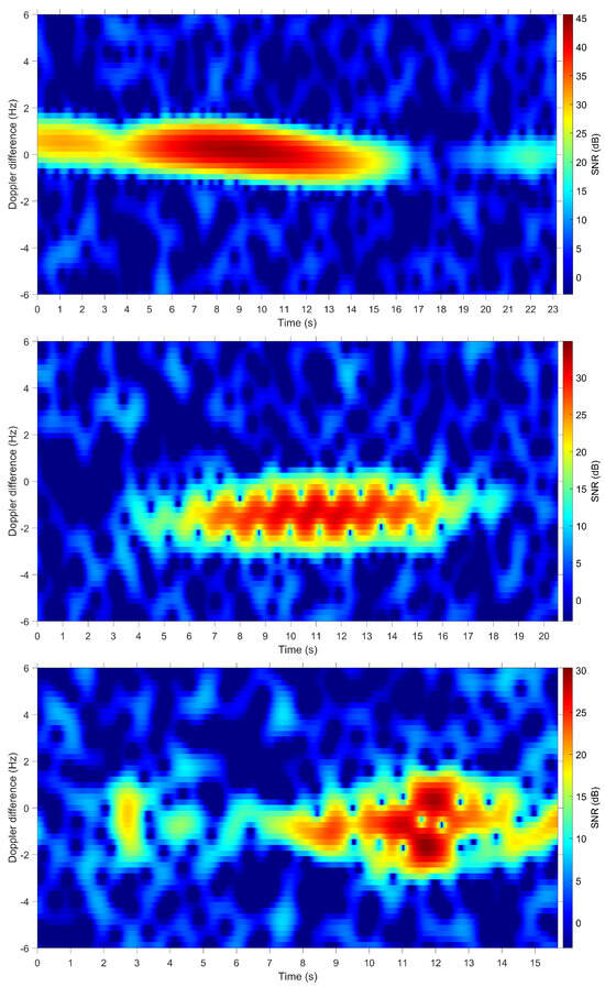 After Keystone-like processing. Top: spectrogram of ALOS-2 showing a single peak; middle: spectrogram of RHESSI showing Doppler broadening and periodic RCS pattern; bottom: spectrogram of Telkom 3 showing micro Doppler features.