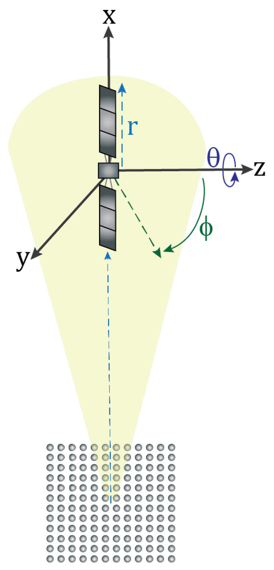 Radar system scenario with the object’s azimuth angle defined as a rotation about the z axis (spin axis) and elevation angle defined as angle from the spin axis to the x–y plane (plane of rotation), which defines the object’s attitude.