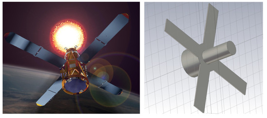 Image of Telkom 3 (left) and simplified CAD model designed in CST Studio Suite (right) [31].
