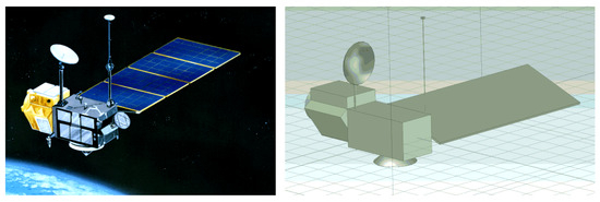 Image of TOPEX/Poseidon (left) and simplified CAD model designed in CST Studio Suite (right).