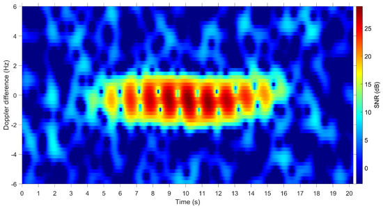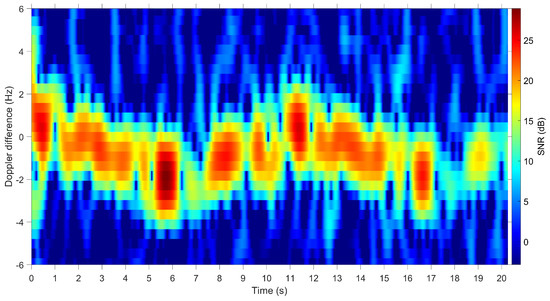 The corresponding spectrogram at an elevation angle of is shown in Figure 14, illustrating a different micro Doppler signature than is shown in Figure 13, highlighting the dependency of the received radar returns on the satellite orientation.