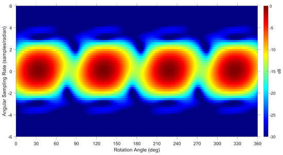 The resolution of the spectrogram is constrained by three factors based on the Doppler ambiguity condition, the linear approximation of the Fourier transform and the Doppler migration condition [33]. The Doppler migration condition is inversely proportional to the electrical size () of the resident space object and determines the angular bin size used in the spectrogram. The results provided in Section 5 use a Doppler migration constraint of to generate sufficient resolution to observe features in the spectrogram, which may include some non-linear effects.