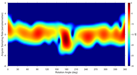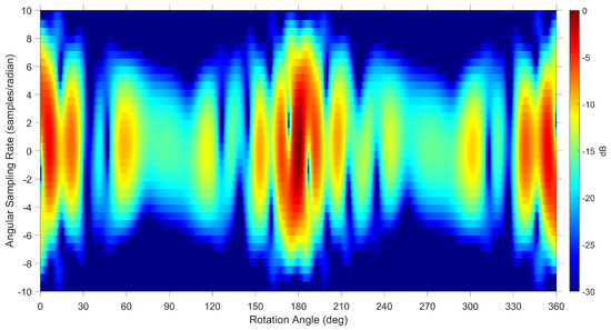 Finer details are not present in the spectrogram when using a lower number of samples in the Doppler or angular sampling rate dimension to process the micro Doppler information. For example, the same data were used to generate the results in Figure 15 as used in Figure 13 but with half the number of samples. The bottom plot in Figure 3 shows the measured data with a similar micro Doppler pattern as Figure 15 illustrating that care needs to be taken in choosing an appropriate number of samples as outlined in Section 4.2.