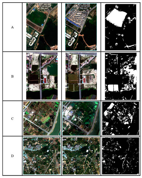 True-color synthesis images and reference images (from left to right: dataset label, bitemporal images, and reference images). (A–D) indicate the dataset labels.
