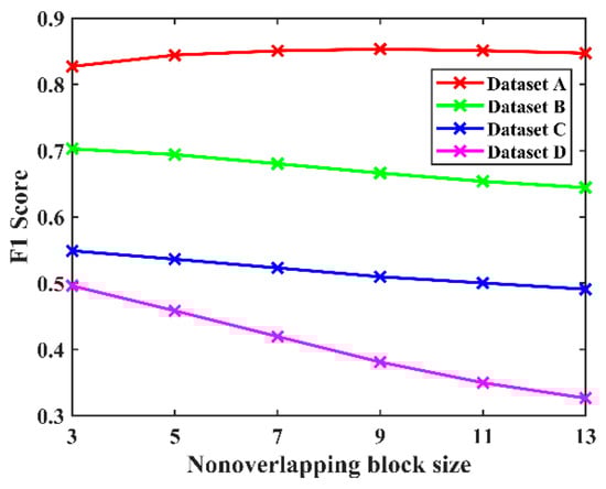 Relationship between F1 score and the nonoverlapping block sizes in PCA-K-means.