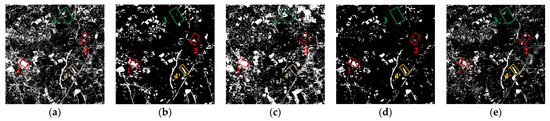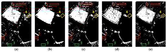 In Figure 15, the values of FA all decrease first and then gradually increase, and the values of MA increase first and then decrease. This variation aligns with our explanation of using and in POTSU to determine segmented objects. Specifically, Otsu usually has a high false detection rate for complex HR data change detection (red line when the number of progressions is 1). The false detection rate decreases sharply after POTSU continues to segment the changed pixels from the last progression (red line when the number of progressions is 2). Still, the missed detection rate increases dramatically simultaneously (green line when the number of progressions is 2), so POTSU continues to judge the segmented objects to gradually balance the false detection and missed detection until the termination condition is reached. Finally, POTSU selects the final progressive result based on the maximum difference between and of each progressive merge result.