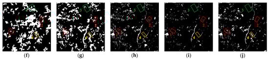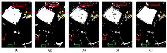 Change regions detected by different methods in dataset B. (a) TCO, (b) PCA-K-means, (c) ASEA, (d) WCIM, (e) DSFA, (f) DCVA, (g) KPCA-MNet, (h) LHSP-E, (i) LHSP-C, (j) reference image. The boxes and numbers indicate the areas compared in the text.