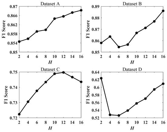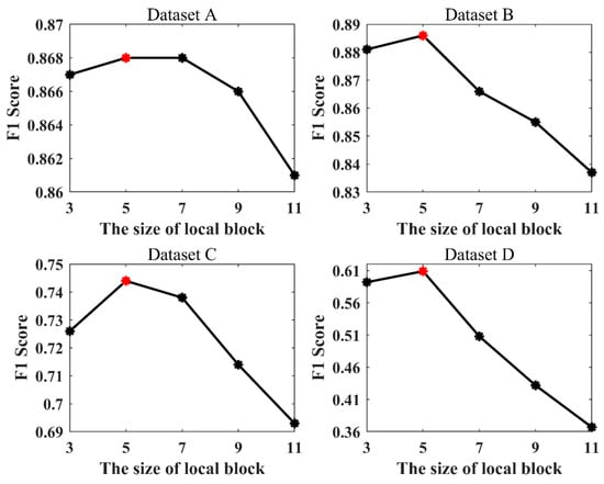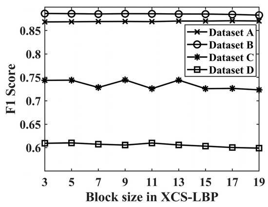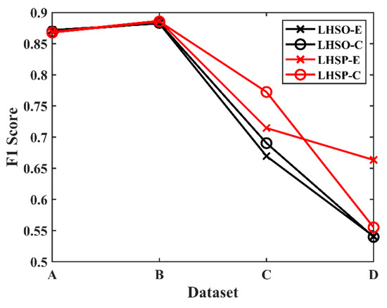 As seen in Figure 14, the differences in the value of F1 are minor for the simple datasets A and B, whether the histogram similarity was measured using the Euclidean or chi-squared distance. However, LHSP achieved better detection results in the more complex datasets C and D.