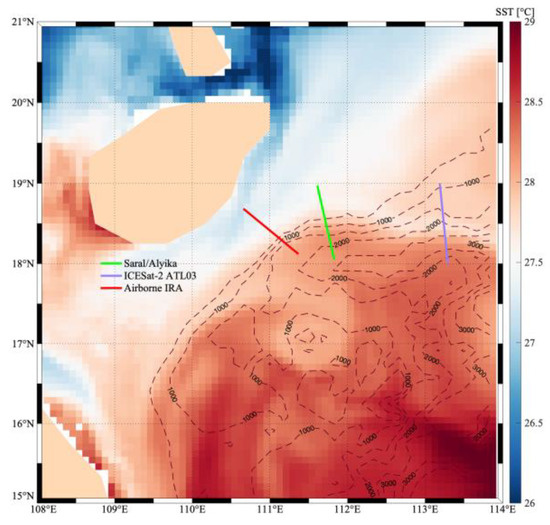 The track of airborne interferometric altimeters, ICESat-2 ATL03 and SARAL/AltiKa. The color on the map represents the sea surface temperature (SST) on 6 November 2021.