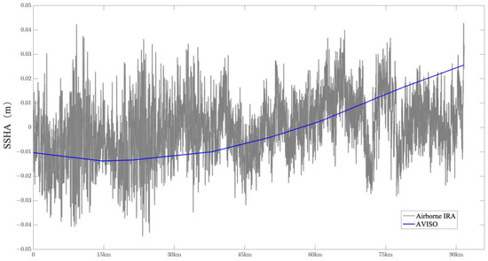 Across-track-averaged SSHA for airborne IRA (gray); gridded SSHA from AVISO for 6 November 2021 interpolated to the IRA track coordinates (blue).