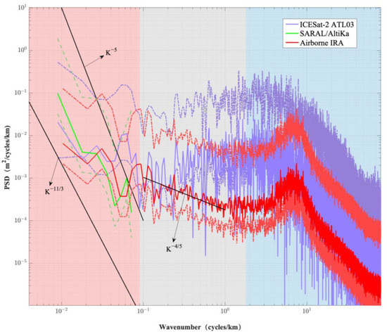 In this study, we examine the wavenumber spectra of IRA, ICESat-2, and SARAL/AltiKa. The Welch method [39] was utilized for power spectral density estimation of the airborne IRA and SARAL/AltiKa, and all IRA along-track spectra were averaged. A three-point moving average was applied to the ICESat-2 ATL03 data to reduce noise before estimating the wavenumber spectrum.