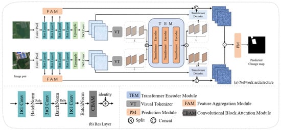 In this paper, two different modules, FAM and CBAM, are applied to construct the architecture of HSAA-Net. As shown in Figure 1, the proposed framework consisted of two parts: a CNN backbone network and a bitemporal image transformer. The input of the network is a bitemporal remote-sensing image. Two ResNet50 [] with shared weights are used as a feature extractor for the input bitemporal remote-sensing image pairs, aggregating different levels of features of each input image through the feature aggregation module for multiscale representation. Image feature maps extracted by ResNet are converted into semantic tokens by using the VT []. Then the tokens are fed into the transformer-encoder to obtain the global semantic information and capture long-range relations to comprehend the global semantic information for each temporal. Afterward, the transformer-decoder is used to project the corresponding semantic tokens into the pixel space to obtain deep features for each temporal refinement. We use CBAM in ResNet’s bottle block to obtain more efficient features. Meanwhile, we use FAM to merge the feature information of the underlying semantics to generate the extracted primary feature maps. Then, the high-level feature maps obtained from the transformer-decoder are concatenated with the extracted primary feature maps from FAM. Finally, we fed the obtained variation feature map into PM to obtain the change map.