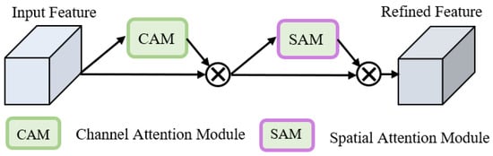 In this paper, we improved ResNet50 by removing the fully-connected layers of the classical ResNet50 and adding CBAM modules to each of the remaining two convolutional layers and four residual layers (ResLayers) to extract bitemporal image feature maps. The convolutional block attention module (CBAM) [] sequentially extrapolates intermediate feature maps along independent dimensions (channel and spatial) to infer attention maps and these attention maps are then multiplied with the input feature maps for adaptive feature optimization. The structure of the CBAM is shown in Figure 3. We integrate the CBAM module after the BatchNorm layer in ResNet’s bottleneck layer, and the outputs from the BatchNorm layer are subjected to the global max pooling and global average pooling based on width and height, respectively, and then passed through the MLP, respectively, and the MLP outputs are subjected to the element-wise feature optimization. The output features of MLP are subjected to element-wise summation and sigmoid activation to generate the final channel attention feature map. Subsequently, the channel attention feature map and input feature map are subjected to element-wise multiplication to generate. The channel attention feature map and input feature map are subsequently multiplied element-wise in order to generate the input features required by the spatial attention module.