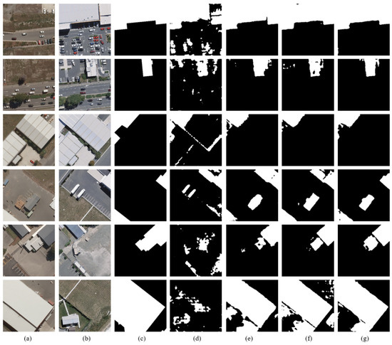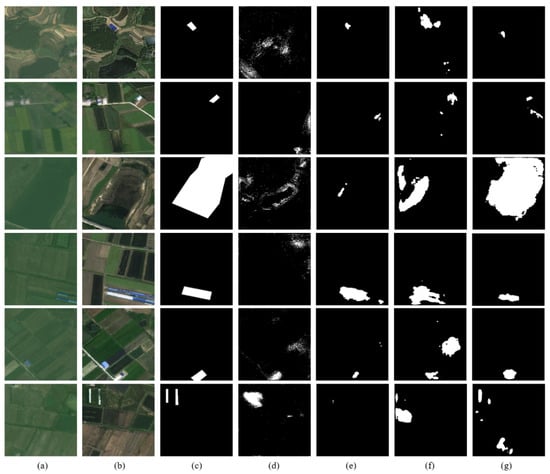Change maps by different methods on the self-built datasets and qualitative comparison of the results. (a,b) The input bitemporal remote-sensing images. (c) Ground truth. (d) SNUNet. (e) DTCDSCN. (f) BIT. (g) Ours. In the change map, white pixels indicate actual changes, and black pixels indicate no changes.