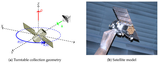 To validate our methods in this paper, we tested using real compact-range radar data obtained from a scale model of a satellite. The data were collected at the Submillimeter-Wave Technology Laboratory at University of Lowell in their 160 GHz center frequency compact range [32], utilizing the turntable geometry shown in Figure 2a [33]. The model scale factor and center frequency were selected such that the ratio of the center frequency to the scale model is comparable to the full-size object. After collection, the data were scaled to X-band (10 GHz center frequency), resulting in a bandwidth of . The satellite scale model, displayed in Figure 2b, is structurally characterized by its hexagonal bus and segmented solar panels, with etched cells and machined hinges along the frame.