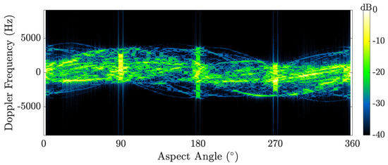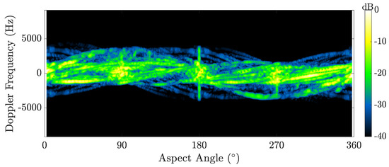 Figure 5 shows a DTI formed for a narrowband setting ( Hz) using data from the compact-range satellite model collect over a single full rotation. The bandwidth is effectively zero such that individual point scatterers are all contained within a single range bin. The DTI shows sinusoidal trajectories of different point scatterers. As observed in Figure 3, we observe bright specular flashes occur for Doppler profiles computed at aspect angle views .