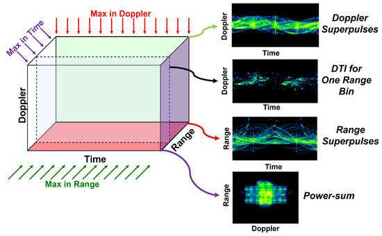 where and is the pulse-repetition frequency of the radar (alternatively, one could interpolate to a grid centered about in place of the ‘round’ operation to achieve a more accurate result). Here, n, m, and k are range, Doppler, and time indices, respectively. Figure 6 illustrates the 3D RDT. In the next section we provide motivation for a number of useful characterization products that can be derived by collapsing (reducing) the dimensionality of the RDT, and by applying scaling/rotation transforms to the RDT. These include Doppler superpulses and range superpulses, which are enhanced versions of the DTI and RTI, respectively, and the power-sum image reconstruction, which is a non-coherent combination of RDMs across one full rotation period.
