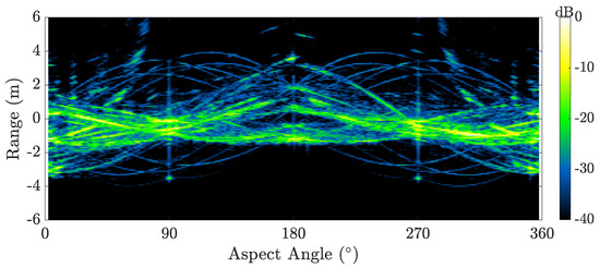 Note that the RTI data in (7) are complex-valued. Because of this, the log power of (7), , is typically displayed for visual interpretation. Figure 3 shows the RTI data for the compact-range satellite model introduced in Section 2.3 over a single full rotation. The bandwidth is large enough such that individual point scatterers are well-resolved in range and trace out sinusoidal trajectories over slow-time. Bright specular flashes occur at aspect angle views .