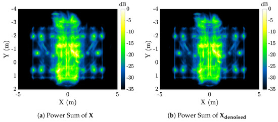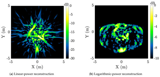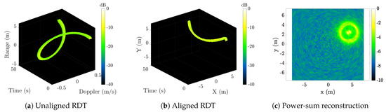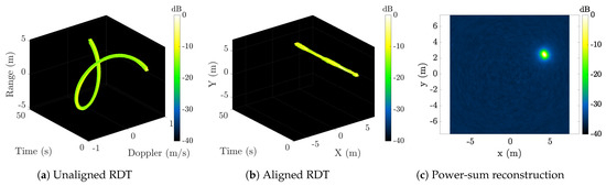 Figure 7 shows an example RTI and RDT generated using simulated radar data for a target scene consisting of two isotropic point scatterers located at and , where . Here, the data were simulated at X-band ( GHz) with bandwidth GHz. Both scatterers trace out separate helical trajectories, each described by (28). For this simulation, the rotation period of the target scene is 50 s. In Section 4.6, we highlight an example where , which causes the defocusing of radar-image reconstructions.