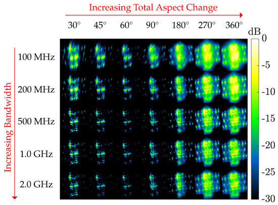 Figure 4a shows a RDM generated from the compact-range dataset using aspect change and bandwidth (scaled to X-band). The RDM reveals the hexagonal bus on the satellite model, with solar panels evident to the left and right of the bus.