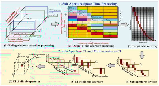 For the sake of joint implementation clutter suppression and coherent maneuvering target detection, this paper considers combined space–time processing-based clutter suppression and RCM/DM elimination based on MLRT within a sub-aperture. There are three main processes in this method, including sub-aperture space–time processing by sliding window processing, range-Doppler echo matrix reconstruction, and RCM correction within the sub-aperture. Finally, the CI of all sub-apertures is realized and the SCNR can be improved significantly.