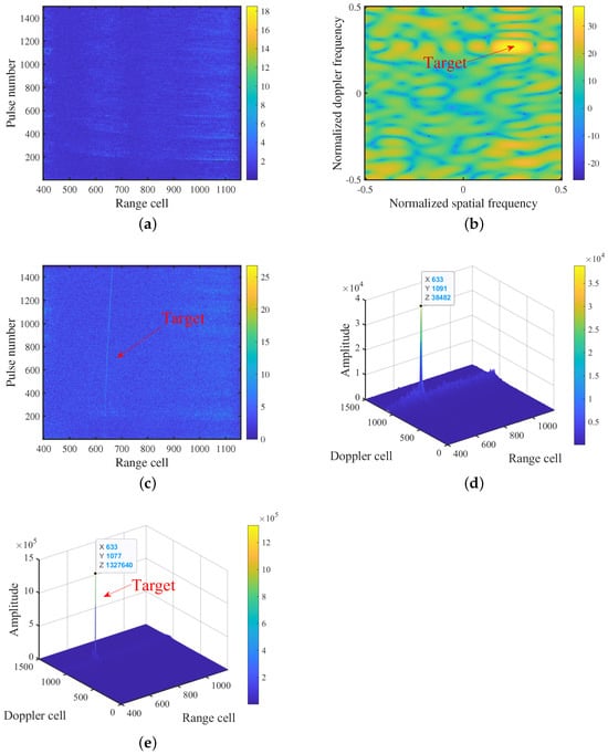Single target simulation results for the proposed method at the −7 dB SCNR. (a) PC result. (b) Sub-aperture space–time filtering. (c) Target echo signal recovery. (d) CI result of the 25-th tertiary sub-aperture. (e) CI result of all sub-apertures.