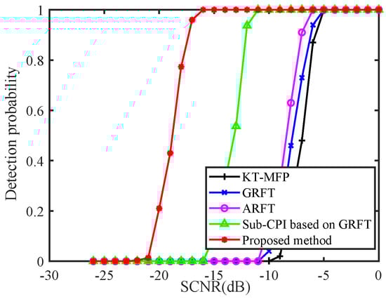In this section, we present the detection probability comparison results, which were obtained via 500 Monte Carlo experiments for each SCNR within the range of [−26 dB, 0 dB], as shown in Figure 9, where the false alarm probability was set as . Taking into account the computational time cost, the pulse number was reset to 640 in this experiment. As shown in Figure 9, the detection probabilities of KT-MFP, GRFT, ARFT, sub-CPI based on GRFT, and the proposed method are given, where the detection ability of the presented method precedes that of the other methods. Particularly, when the detection probability , the proposed method required a lower SCNR after PC as compared to KT-MFP, GRFT, ARFT, and sub-CPI based on GRFT by about 11 dB, dB, 10 dB, and 5 dB, respectively.