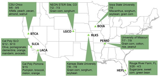 Geographical locations of study sites in the contiguous United States, with relative field sampling dates (month/day) and crop species labeled. All fieldwork was conducted in the year 2022 (modified from []).
